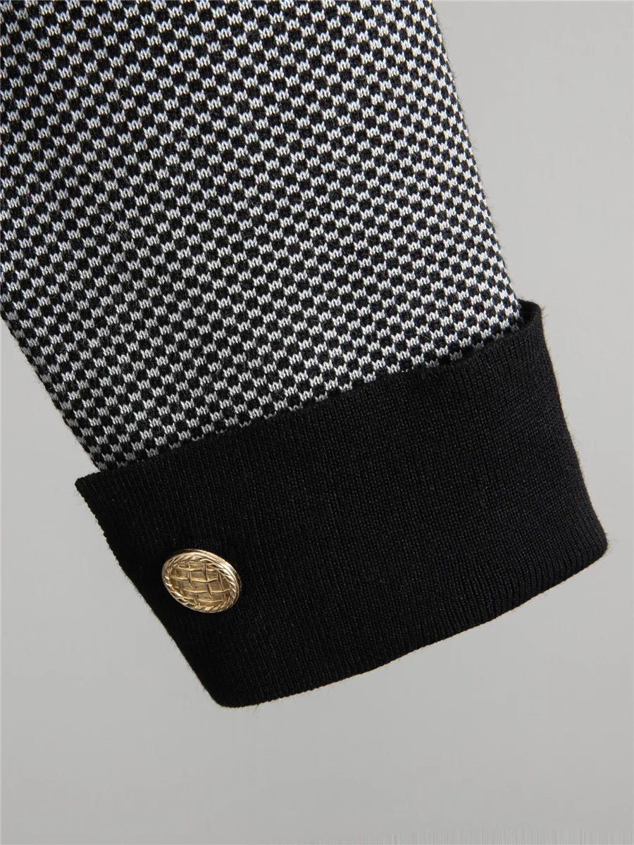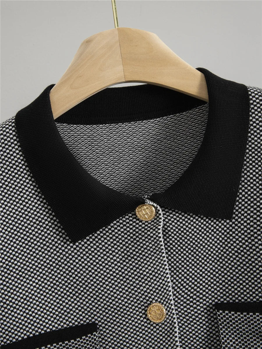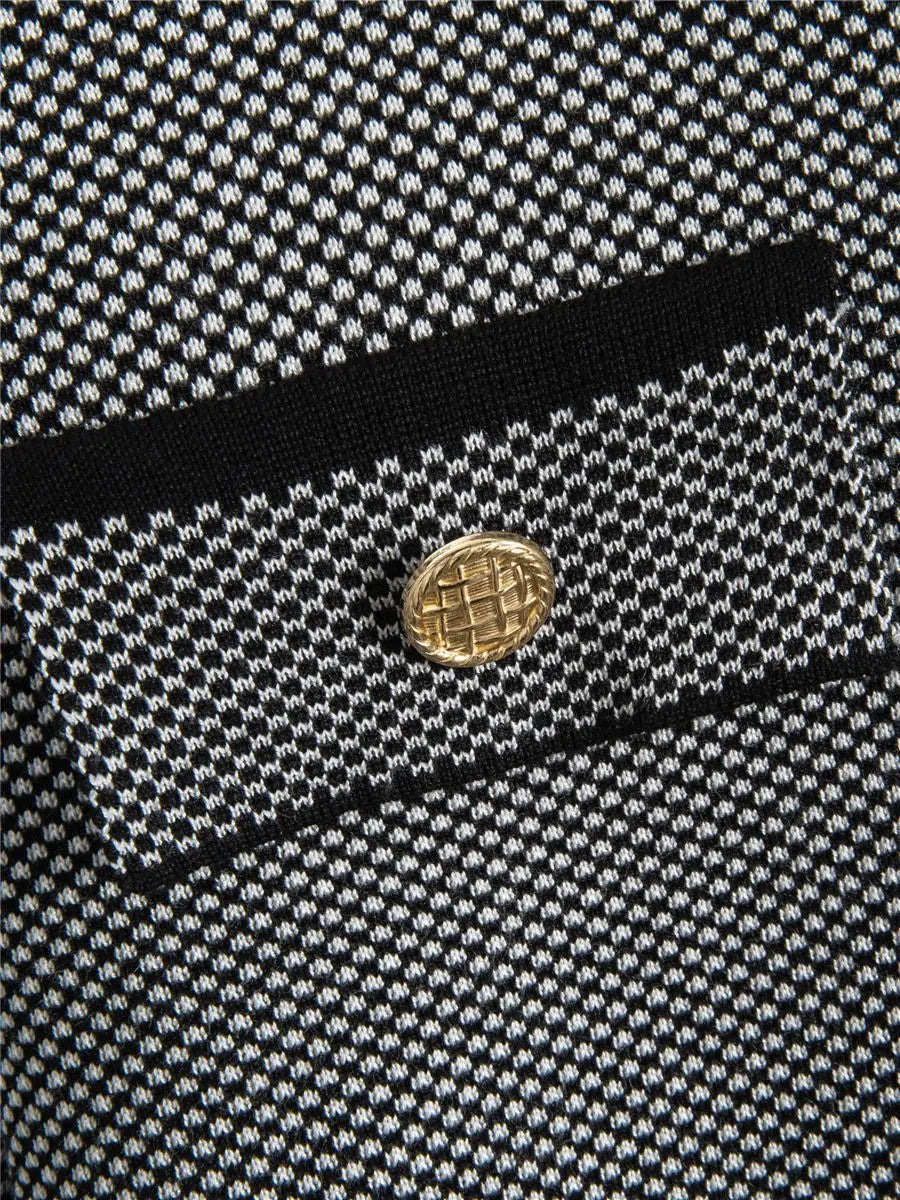 Achieve instant polish with the Vera Women's Cashmere Blend Contrast Trim Knit Suit. This elegant two-piece ensemble includes a classic collared button-up knit top and matching wide-leg trousers. Crafted from a soft, premium blend that includes cashmere, the houndstooth-like texture and crisp black contrast trim and gold-tone buttons give the set a refined, "Chanel-esque" appearance. Perfect for work-from-home luxury, travel, or elevated everyday wear, this Vera knit suit is a versatile and stylish luxury staple.